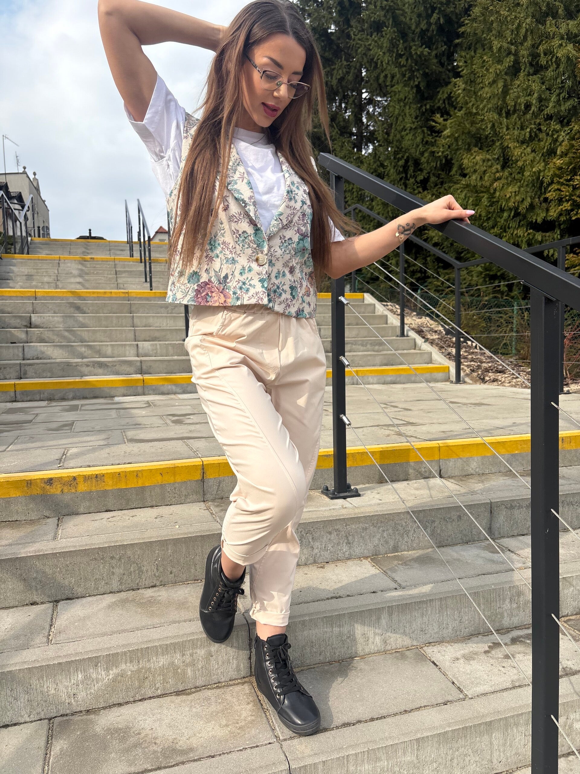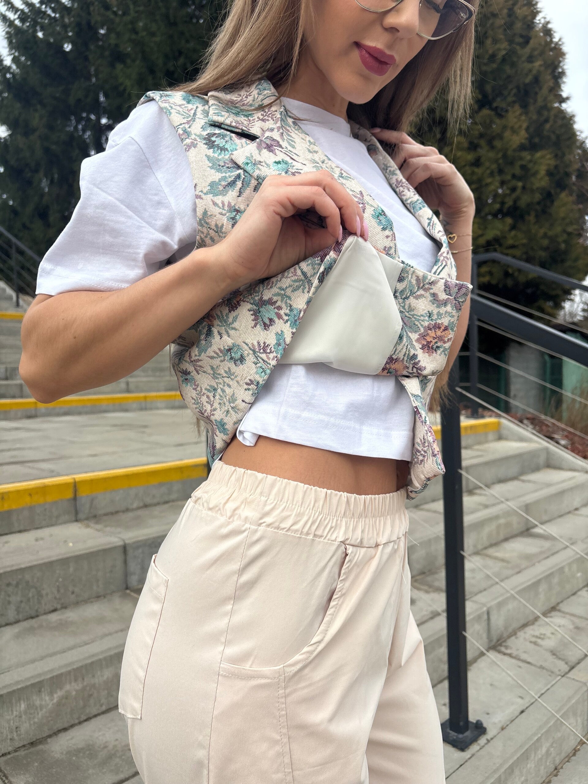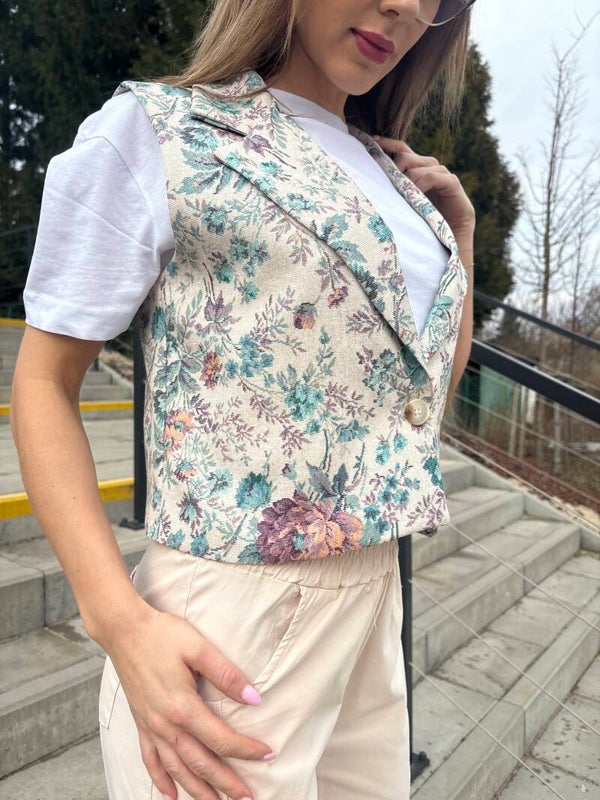 Lekka, wiosenna kamizelka usztyta z miękkiego, przyjemnego materiału. Jej prosty swobodny krój sprawia, że idealnie układa się na sylwetce, dodając stylizacji lekkości i świeżości