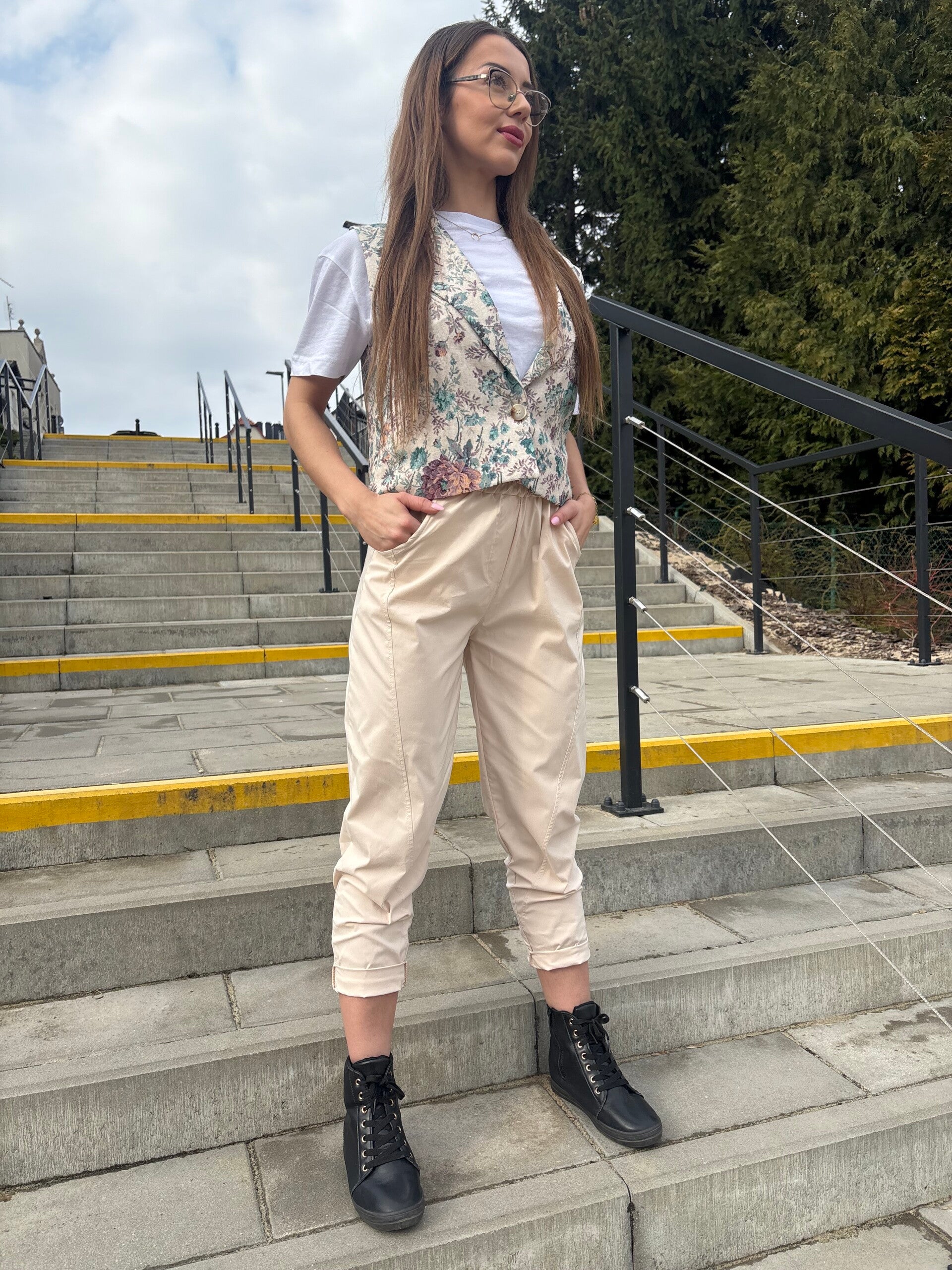 Beżowe, wiosenne spodnie o lekkim i wygodnym fasonie, stworzone z myślą o codziennym komforcie i swobodnym stylu. Wykonane z elastycznego materiału, który delikatnie dopasowuje się do sylwetki.
