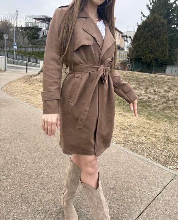 Elegencki, długi, zamszowy płaszcz to kwintesecja klasy i ponadczasowego stylu. Wykonany z miękkiego, przyjemnego w dotyki materiału o zamszowym wykonczeniu. Jego wydłużony krój pięknie wysmukla sylwetkę dodając całości lekkości i elegancji